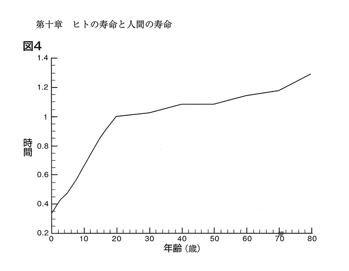 生物にはいろいろな時間(体内時計など)がひそんでいる。その時間によって生物たちは生きている。哺乳動物にかぎっても、たとえばヒトは心臓をドキンと一回打つ心周期はおよそ一秒だが、ハツカネズミは0.1秒、ふつうのネズミは0.2秒、ネコが0.3秒、ウマでは2秒、ゾウでは3秒になる。体の大きさに比例して心周期が異なっているわけだ。