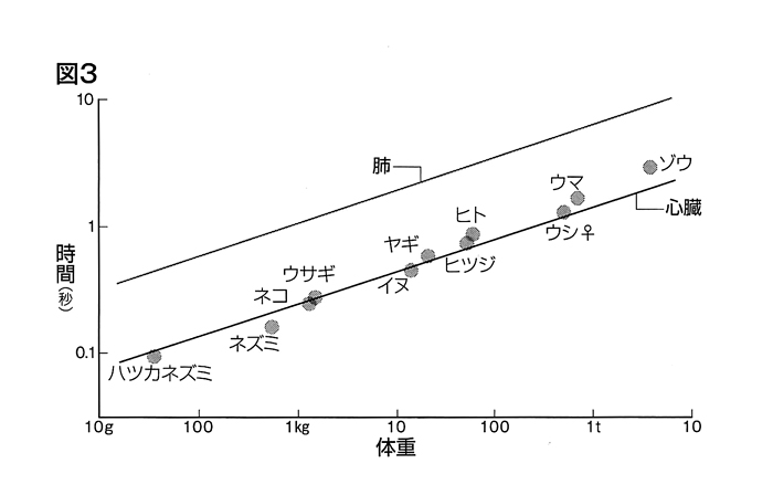 要する時間と体重との関係。これも心臓のものとほぼ平行な直線となる。