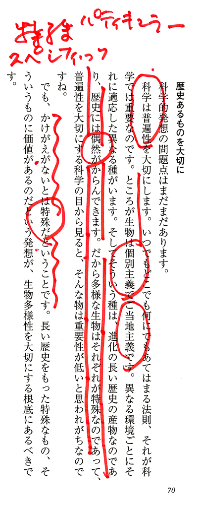 生態系ではそんなことをしない。生物たちがそれぞれの「かけがえのなさ」をつくりつつも、互いに関係をもちあい、複雑に絡みあってきた。共生経済なのである。それゆえ生物多様性が質の違いの多様性として維持されてきた。その質の違いを維持するためにバッタやイワシやネズミは大量の子孫候補を輩出し、土壌菌や根粒バクテリアが「あいだ」をつないできた。