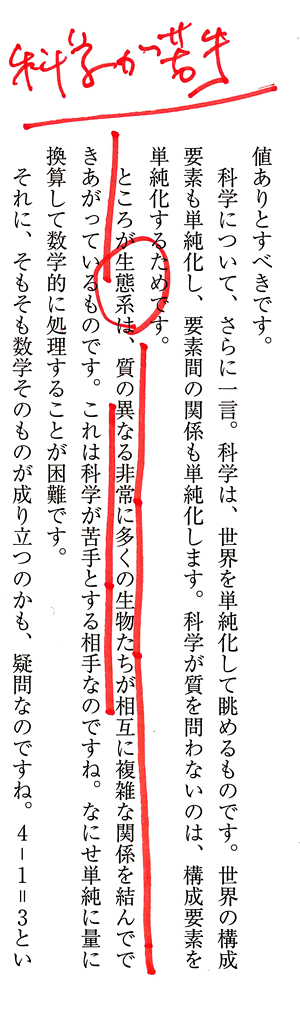 生物のほうは競争をするとしてもご当地本位だ。苔とイワシが戦うことはなく、ワシとサンゴが戦うということはない。生態系はそこをちゃんと仕切ってきた。しかし、その生態系を文明が便利に活用するとなると、とんでもない組み合わせの比率や不均衡が生じていく。どこかの家庭でサンマ一匹を食べるのに、どれほどの労力と流通過程と地元経済が巻きこまれていくか。想像もつかない不均衡がおこるのだ。